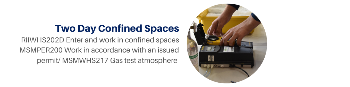Confined Spaces Course Options There are 2 courses for Confined Spaces training, 1 full day course: Confined Spaces or two 2 day courses: Gas Test Atmposphere or Issued Permits + Confined Spaces.
